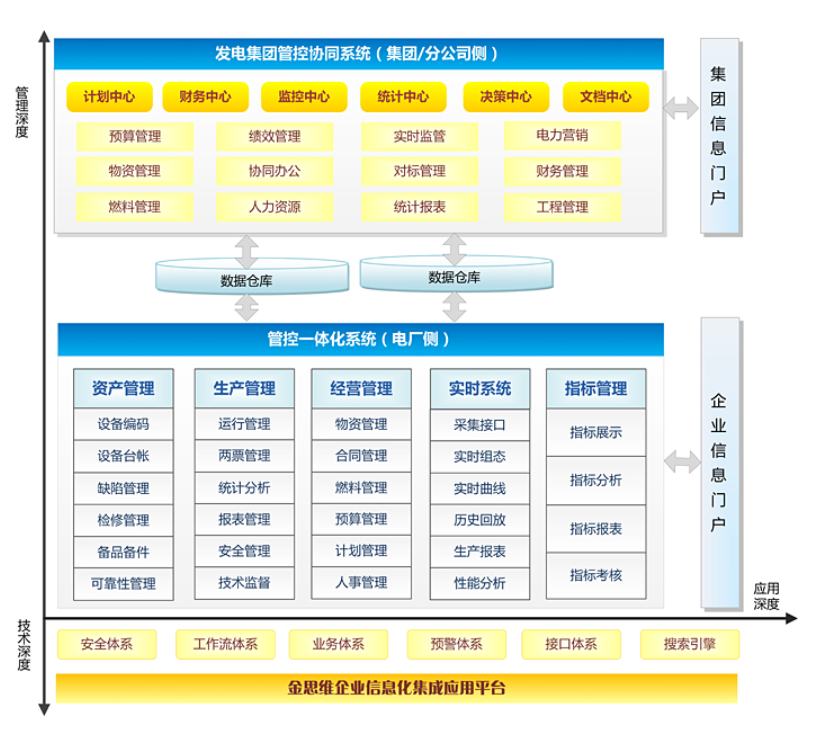 发电集团信息化解决方案针对集团化管理模式,以全面预算和成本控制为核心,以计划管理为龙头,以协同办公、实时数据、财务分析、对标考核、燃料物资、基建工程和安全监督为基础,构建发电集团管控一体的信息化平台: